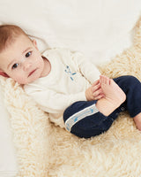Your cotton baby clothing can be machine washed with cold water (no bleach), but do not tumble dry. Rather, lay flat on a towel and roll up to absorb the extra water. A warm iron can be used if desired.